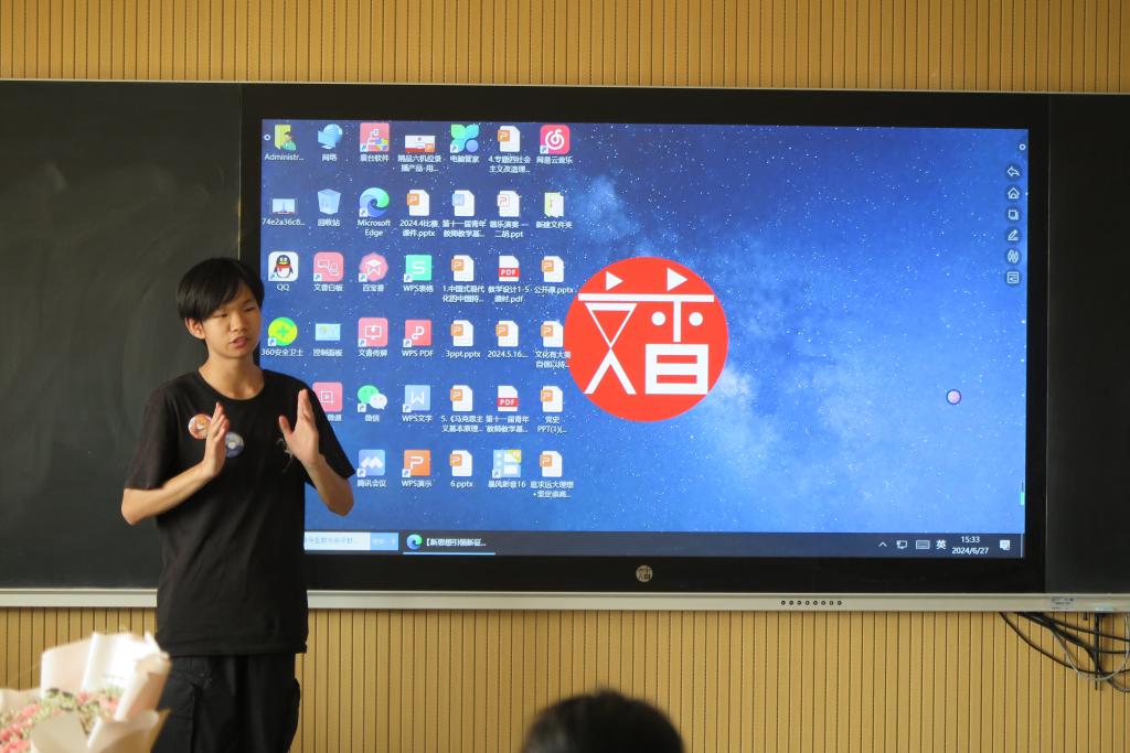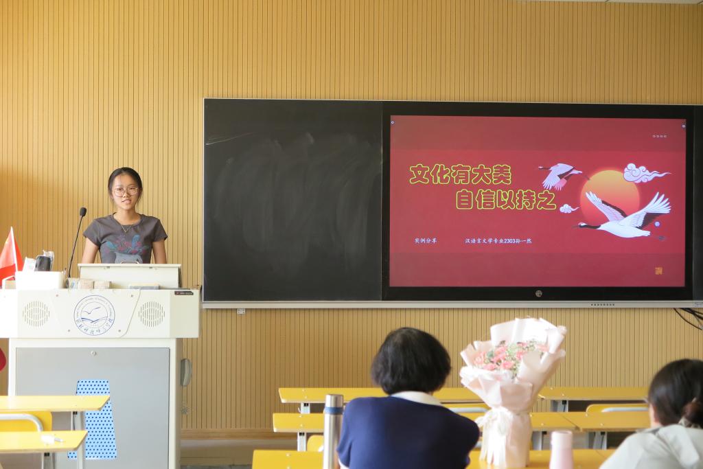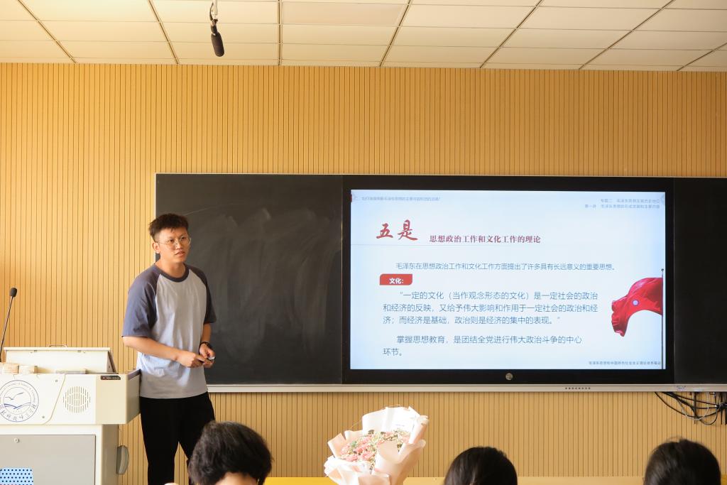 在学生展示过程中,物流2302班孔维以《论持久战矛盾光辉》为题;财管2302班罗璇以《百年征程,波澜壮阔》为题;电子2202班李佳鑫以《五四精神长存,中国风华正茂》为题;汉本2303班孙一然以《文化有大美,自信以持之》为题;信息2101班马郡镁以《追求远大理想,坚定崇高信念》为题分别进行了精彩的课堂展示,充分表现出了新时代大学生的马克思主义理论素养和青春激昂的风采。